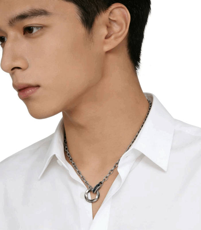 The minimalist cross-style chain adds a clean, bold character, giving the necklace a strong yet sophisticated presence that complements modern masculine style.