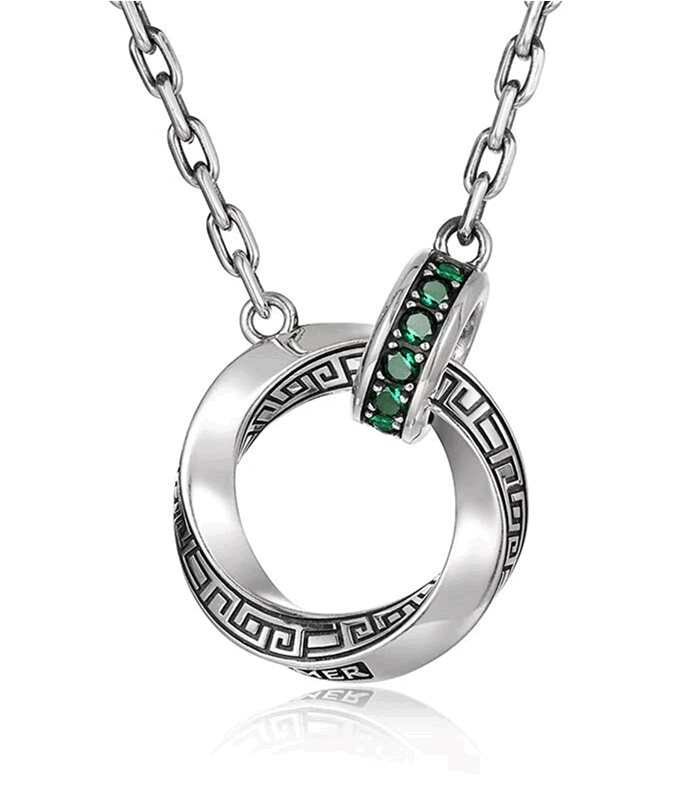 This piece features an interlocking double-ring Möbius design, symbolizing infinity and continuity. The outer ring is engraved with an elegant Eastern geometric pattern, while the inner ring is accented with finely set stones, blending the romantic symbolism of the Möbius form with the depth and refinement of traditional Eastern aesthetics.