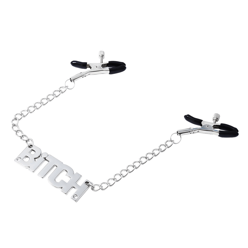 These adjustable nipple clamps feature a bold hanging word charm, designed to enhance consensual adult roleplay and personal expression. Each charm displays a role label—Bitch, Slut, Slave, or Daddy—allowing you to choose the one that best matches your preference, mood, or dynamic.